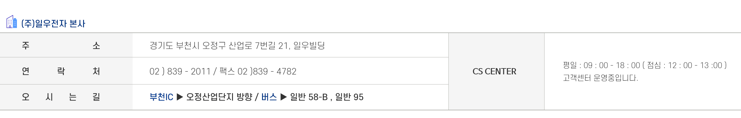 회사명 : (주)일우전자 ㅣ 경기도 부천시 오정구 산업로 7번길 21, 일우빌딩 ㅣ 대표자명 : 박수종 ㅣ 사업자번호 : 119-81-87289